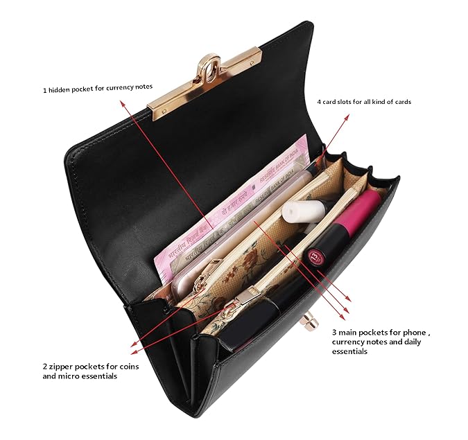 • Main Compartments: Dedicated pockets for phone, daily essentials, and currency notes. Spacious design to accommodate various items securely.
