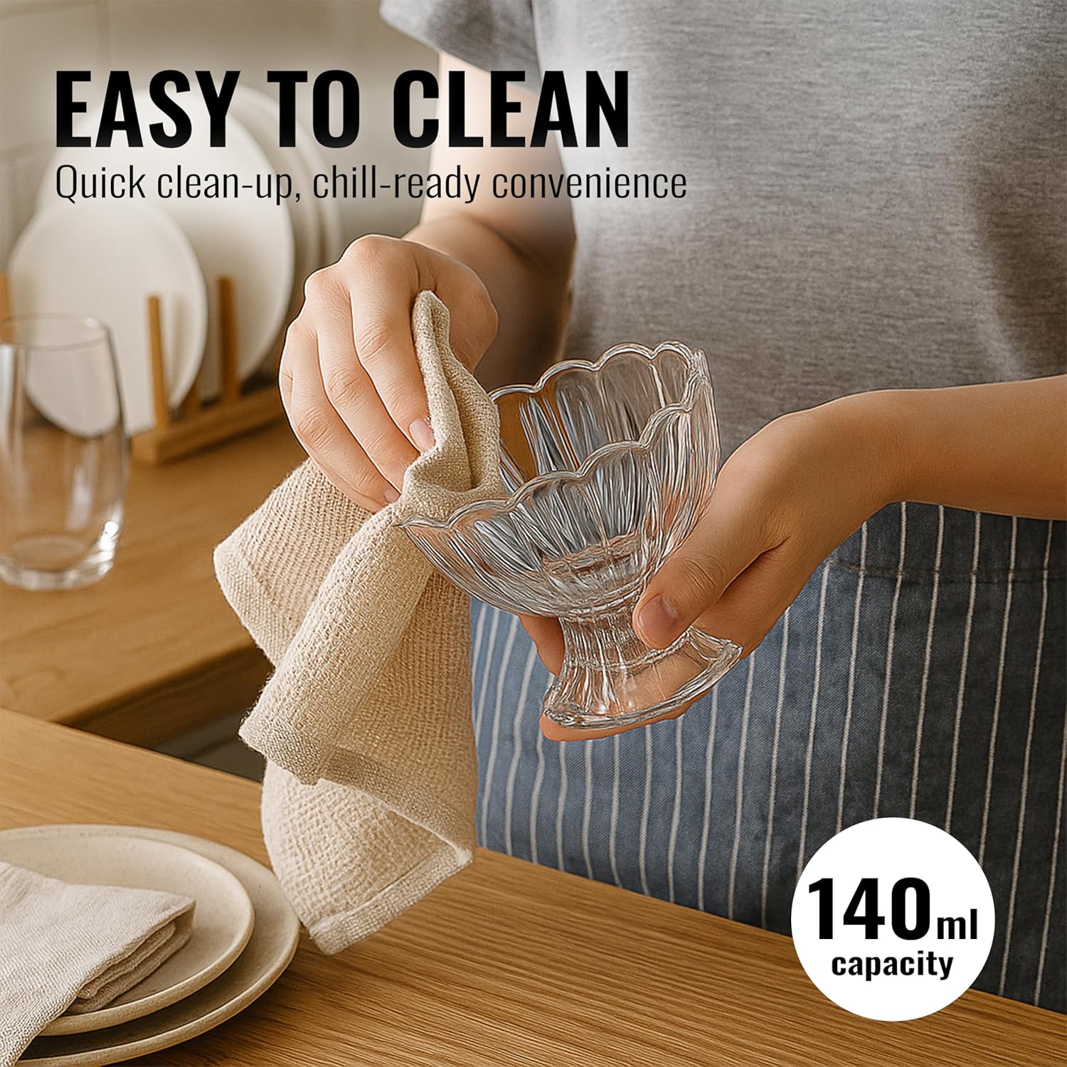 - VERSATILE 6-PIECE SET: This glass ice cream bowl set of 6 beautifully crafted bowls designed to serve a variety of desserts, from ice cream and sundaes to fruits, puddings, and snacks. A perfect addition to any kitchen or dining collection for everyday use and special occasions.