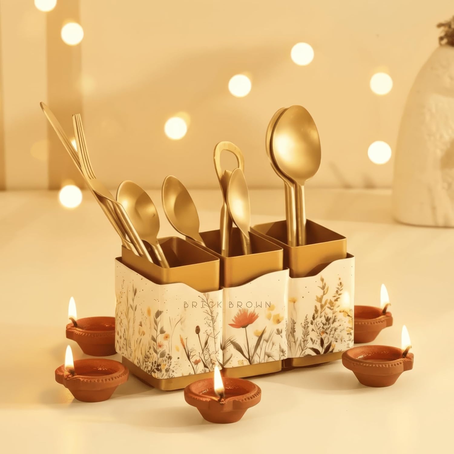 Brick Brown® Premium Metal Triflora Cutlery Holder – Spoon Stand for Kitchen | Spoon Holder for Dining Table | Wooden Caddy Storage Organizer | Stand Caddy Holder for Kitchen Utensils (6.3x8x9.5in)