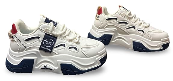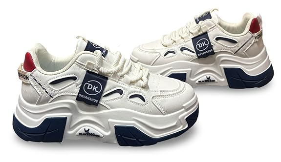 - STYLE: Chunky platform sneakers featuring a modern design with white and navy colour scheme, perfect for contemporary fashion-forward looks
