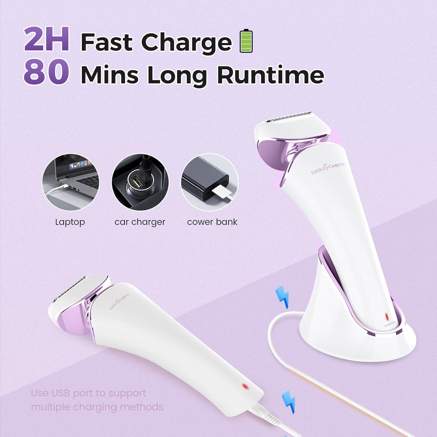 • DIRECT CHARGING & USB DOCK CHARGING: Electric hair remover comes in 2 different ways to charge the ladies shaver which charges with a USB cable to the power supply through direct or USB dock charging. The shavers provide 80 minutes of cordless use after a 2-hour charge. NOTE: Please use a 5V1A adapter to charge your shaver. Using fast charging devices may damage the circuit board and render the razor can’t turn on after charging. This shaver is compatible with charging via a computer, a special 5V1A power adapter, a battery pack or a car charger.