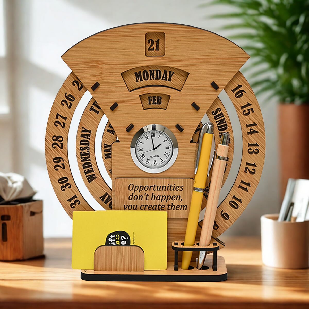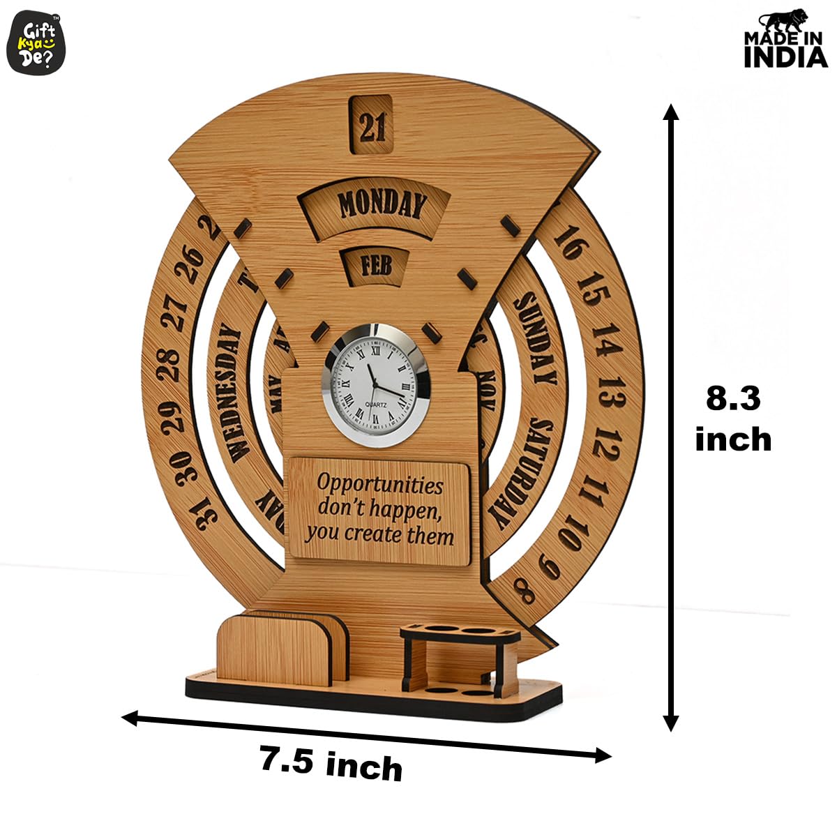 GKD Lifetime Wooden Desk Calendar 2026 with Clock & Desk Organizer | Reusable Infinite Calendar | Office & Home Desk Decor | Corporate Gift (Bamboo Eco-friendly)