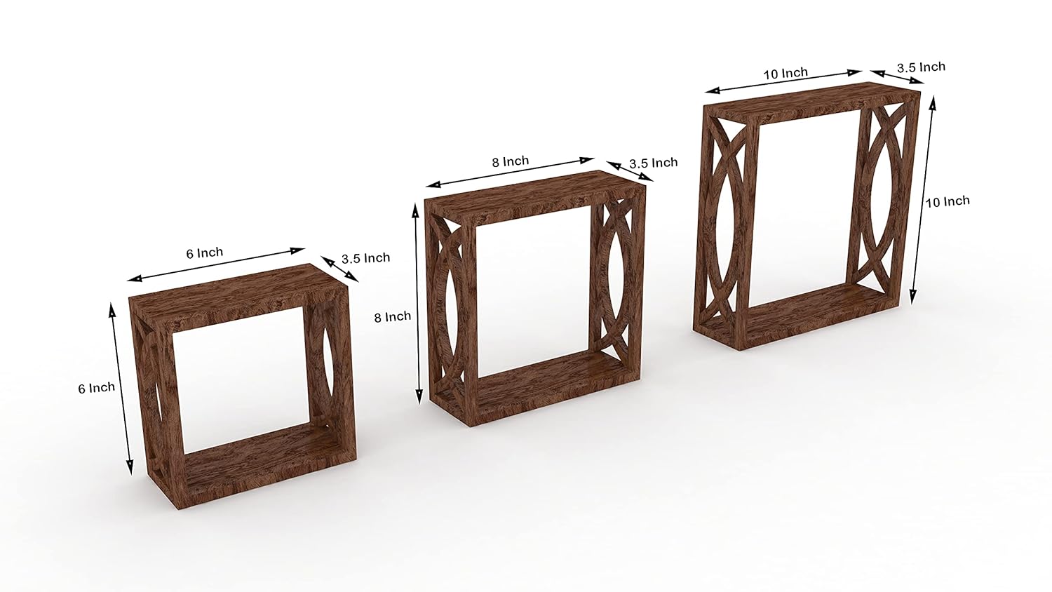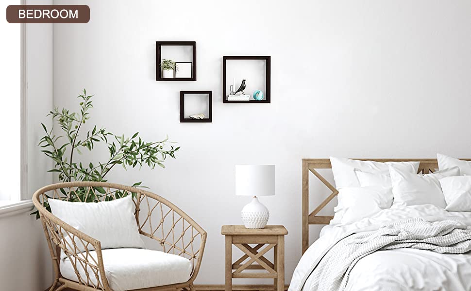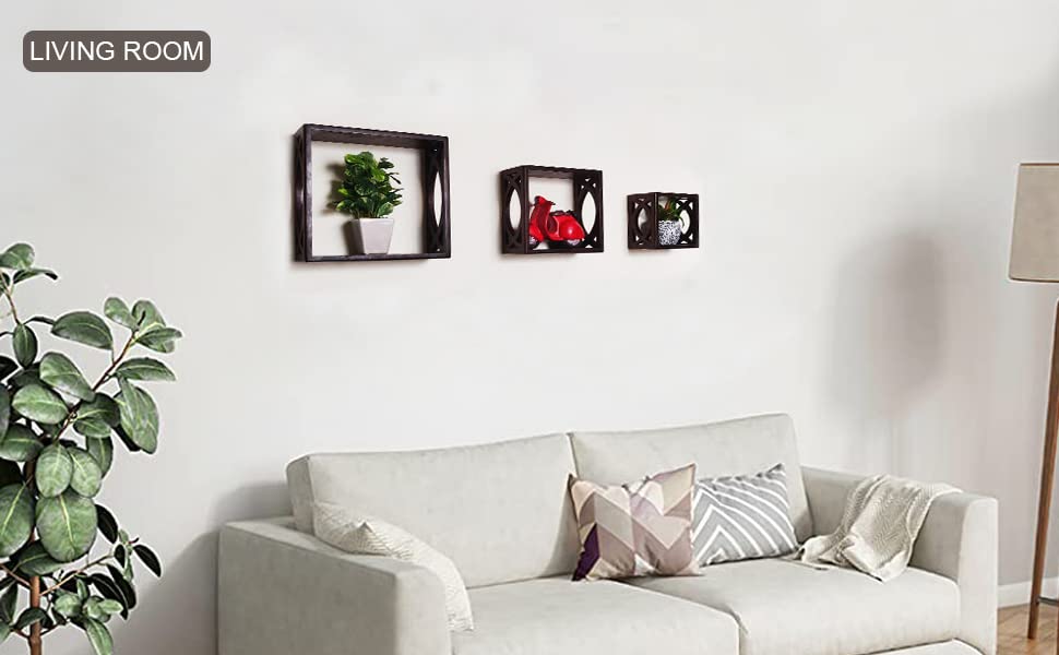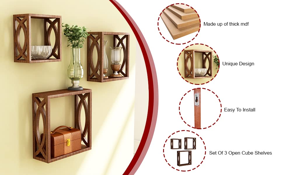- Set of 3 decorative, wall-mounted cube shelves made from durable MDF wood with a rich brown finish.