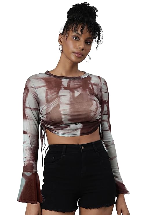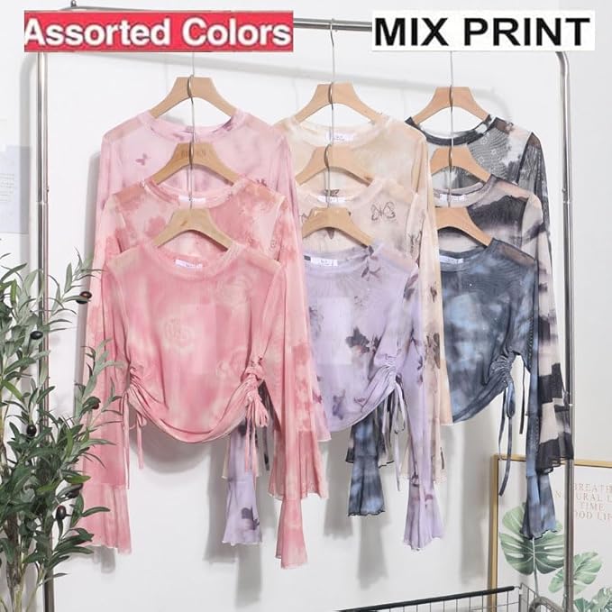 ICW Women French Retro Knitted Long Sleeves Round Neck Mesh Tie-Dye Printed Crop Top T-Shirt 301