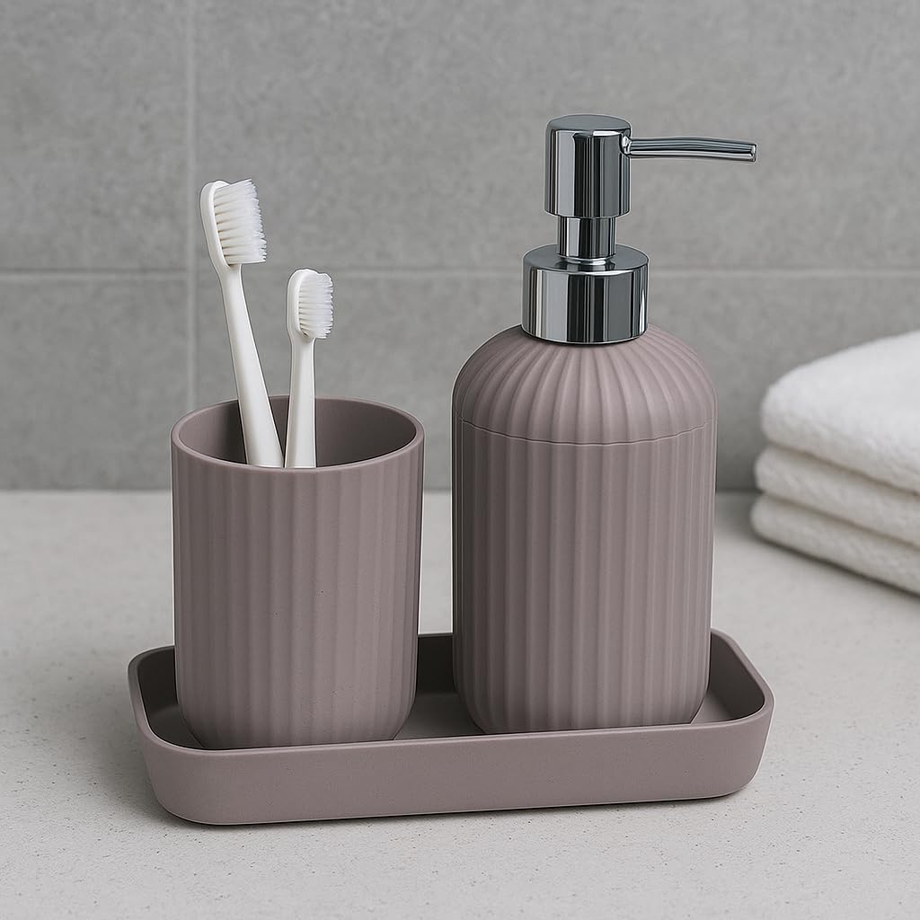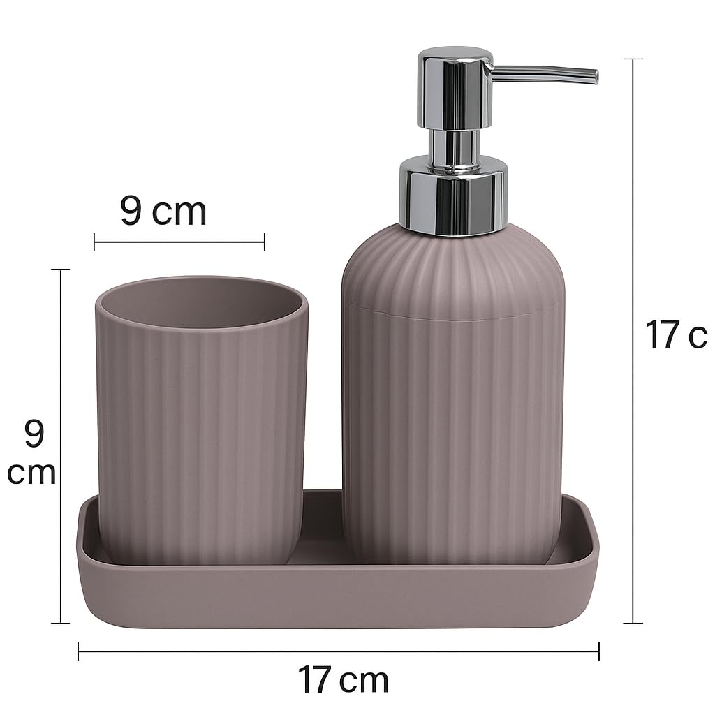 • 3-Piece Bathroom Set – Includes 1 Soap Dispenser (17 cm), 1 Toothbrush Holder (9 cm x 6.5 cm), and 1 Tray (17 cm) for a complete countertop solution.