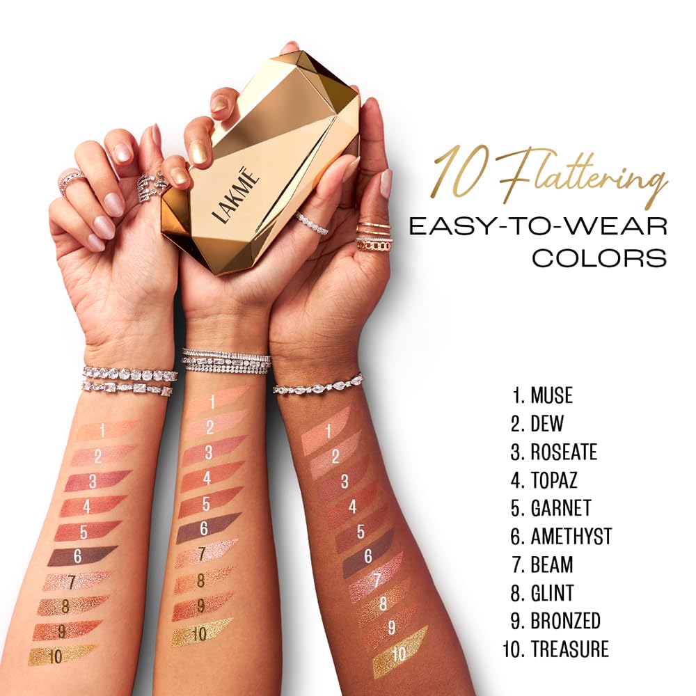 - JEWEL-TONED GLAMOUR: Lakme Bejewel Multichrome Eyeshadow Palette features 10 shades in matte, shimmer, marble, and foil textures for vibrant, crease-resistant looks.