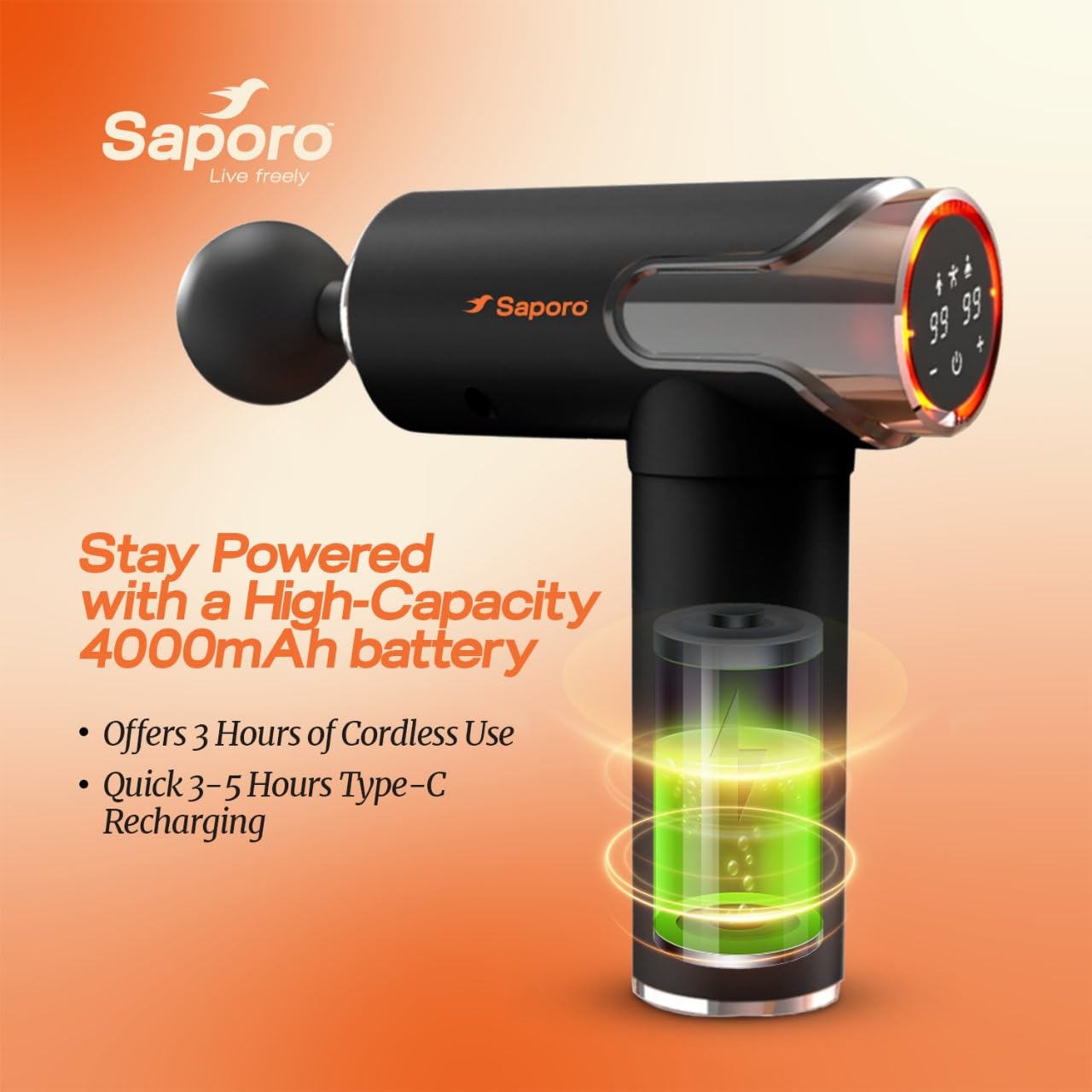 - Long-Lasting Battery & Type-C Charging: Equipped with a 4000 mAh rechargeable battery, the cordless pulse gun massager supports Type-C charging and delivers 2–4 hours of uninterrupted use on a single charge