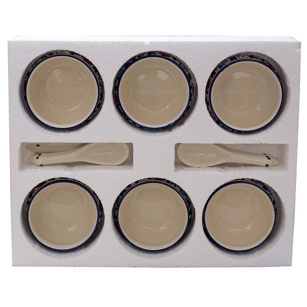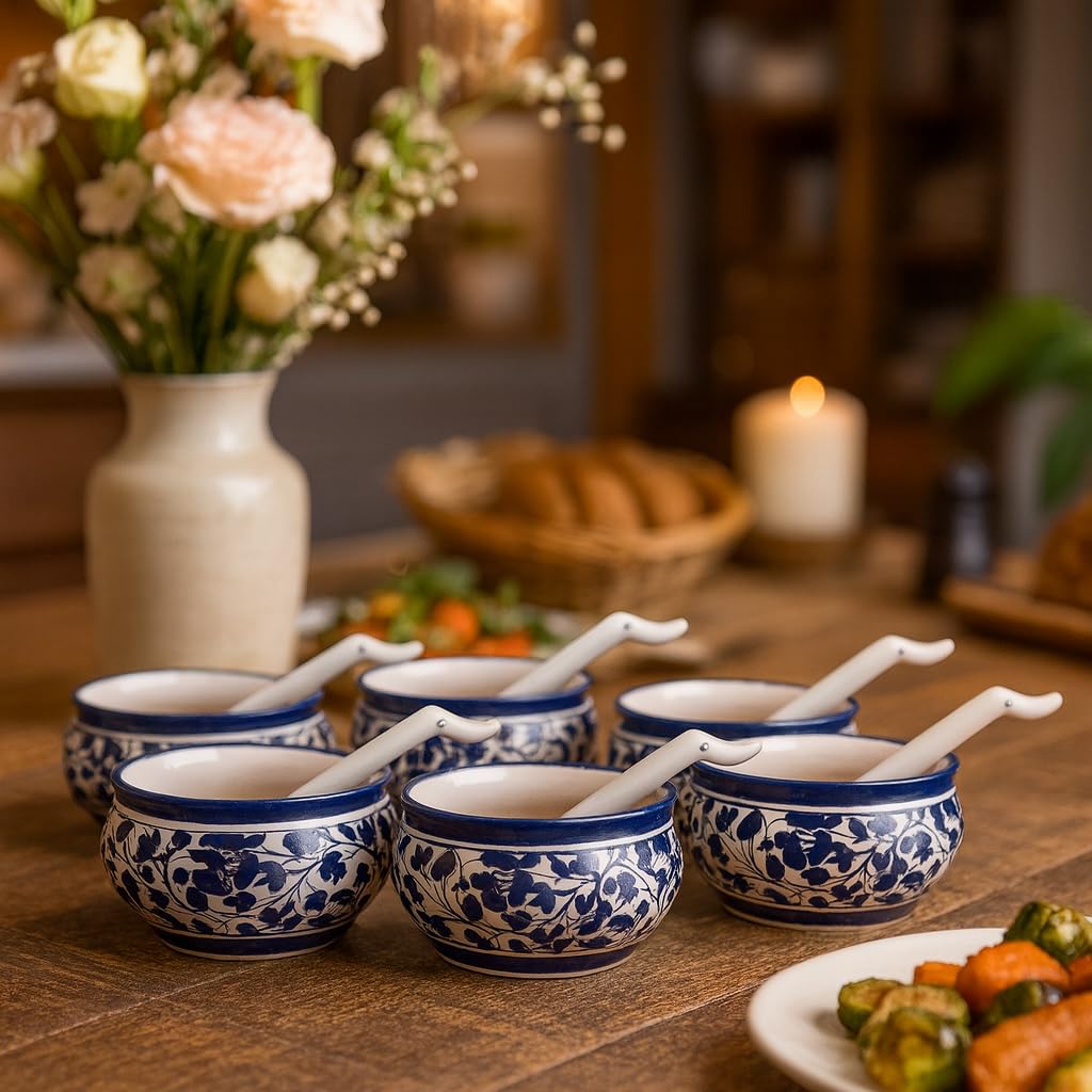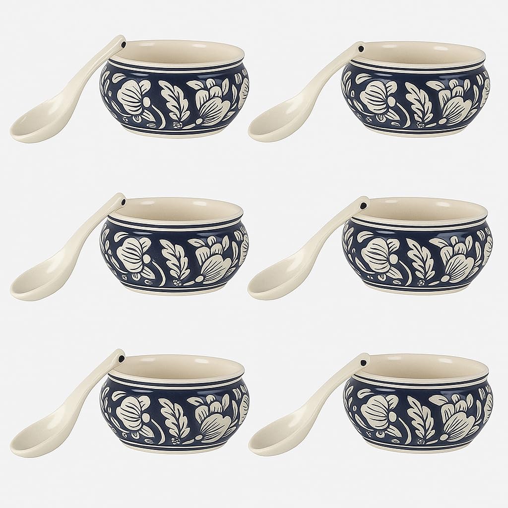 Maya | Hand-Painted Ceramic Soup Bowl Set of 6 with Spoons | 300ml Each | Multi-Purpose Serving Bowls for Soup, Snacks, Noodles | Elegant Gift Set | Microwave & Dishwasher Safe (Warli)