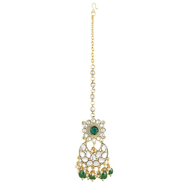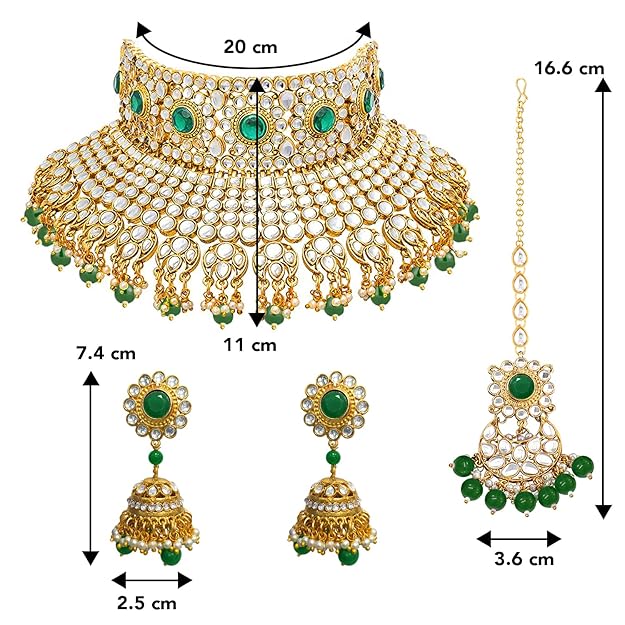 - DIMENSIONS: Necklace Length – 20 cm x Width – 11 cm, Earring Height – 7.4 cm x Width – 2.5 cm, Maang Tikka – 16.6 cm x Width – 3.6 cm, Weight – 278 grams