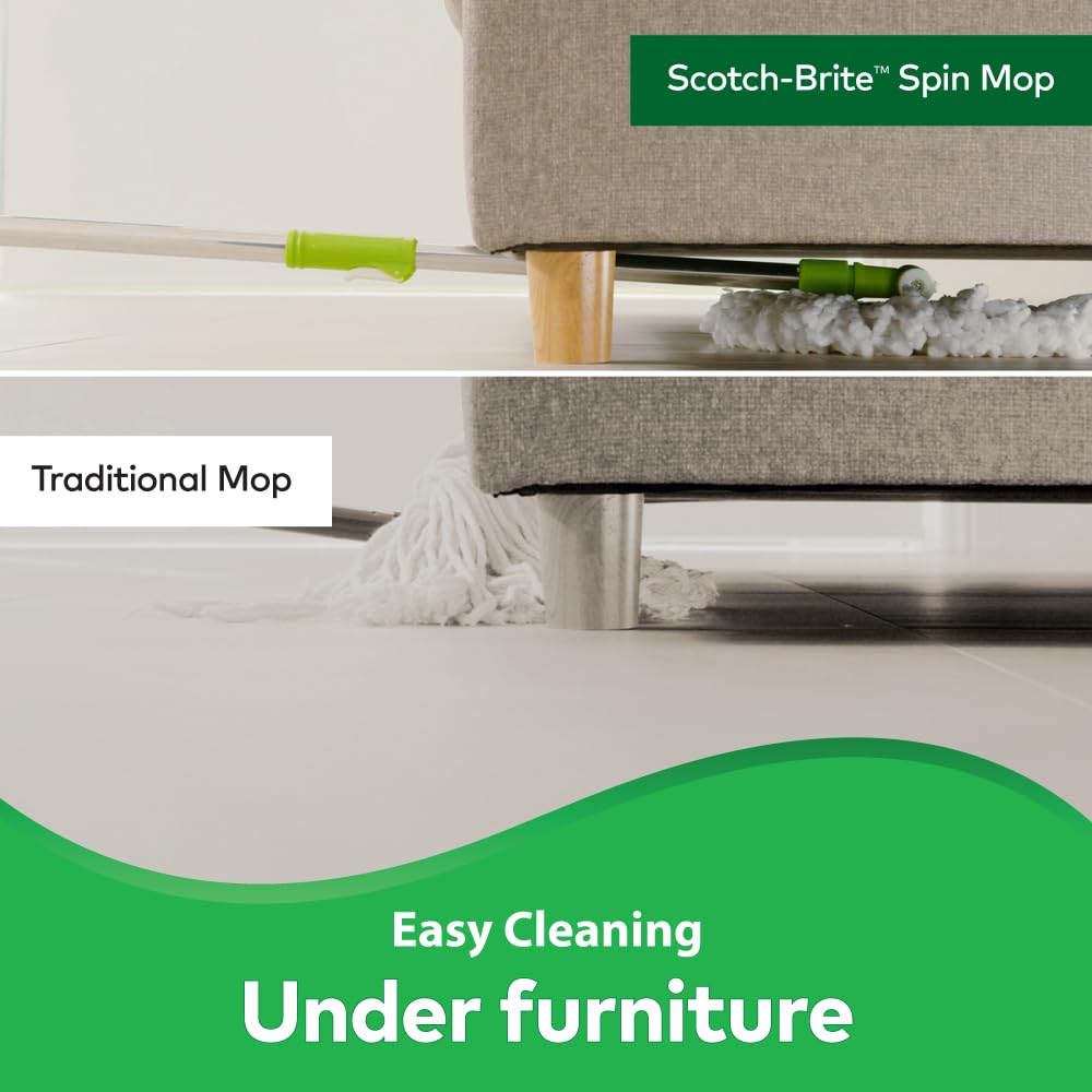 Scotch-Brite Twin Bucket Spin Mop with Easy Wring & Rinse System, 360° Adjustable Handle, High Absorbency Microfiber for Deep Cleaning on All Floor Types, 1 Extra Refill (Green)