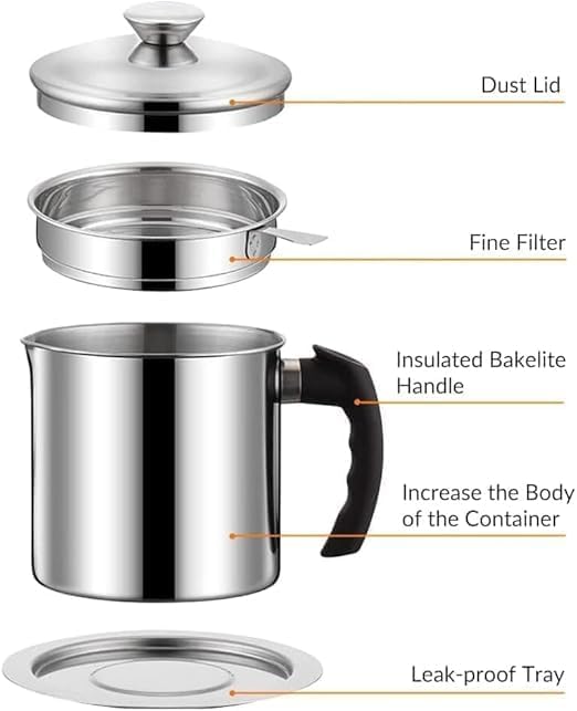 - MULTI-PURPOSE USE FOR EVERY KITCHEN – Ideal for straining and storing frying oil, bacon grease, ghee, or sauces. Reduce waste and reuse oil while keeping your kitchen tidy and eco-friendly.