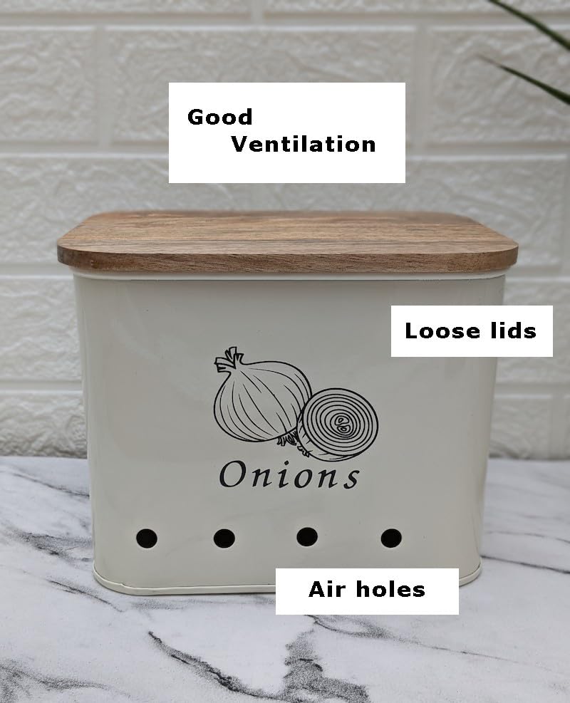 - Dimensions: Potato box: 8.5X6.5X7 inches Onion box: 7.5X6X6inches Garlic box: 6.6X5.5X5 inches
