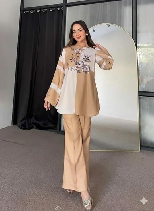 - STYLISH CO-ORD SET: Trendy two-tone A-line kurti paired with matching pants, featuring an elegant beige and cream colour combination with beautiful floral print detailing