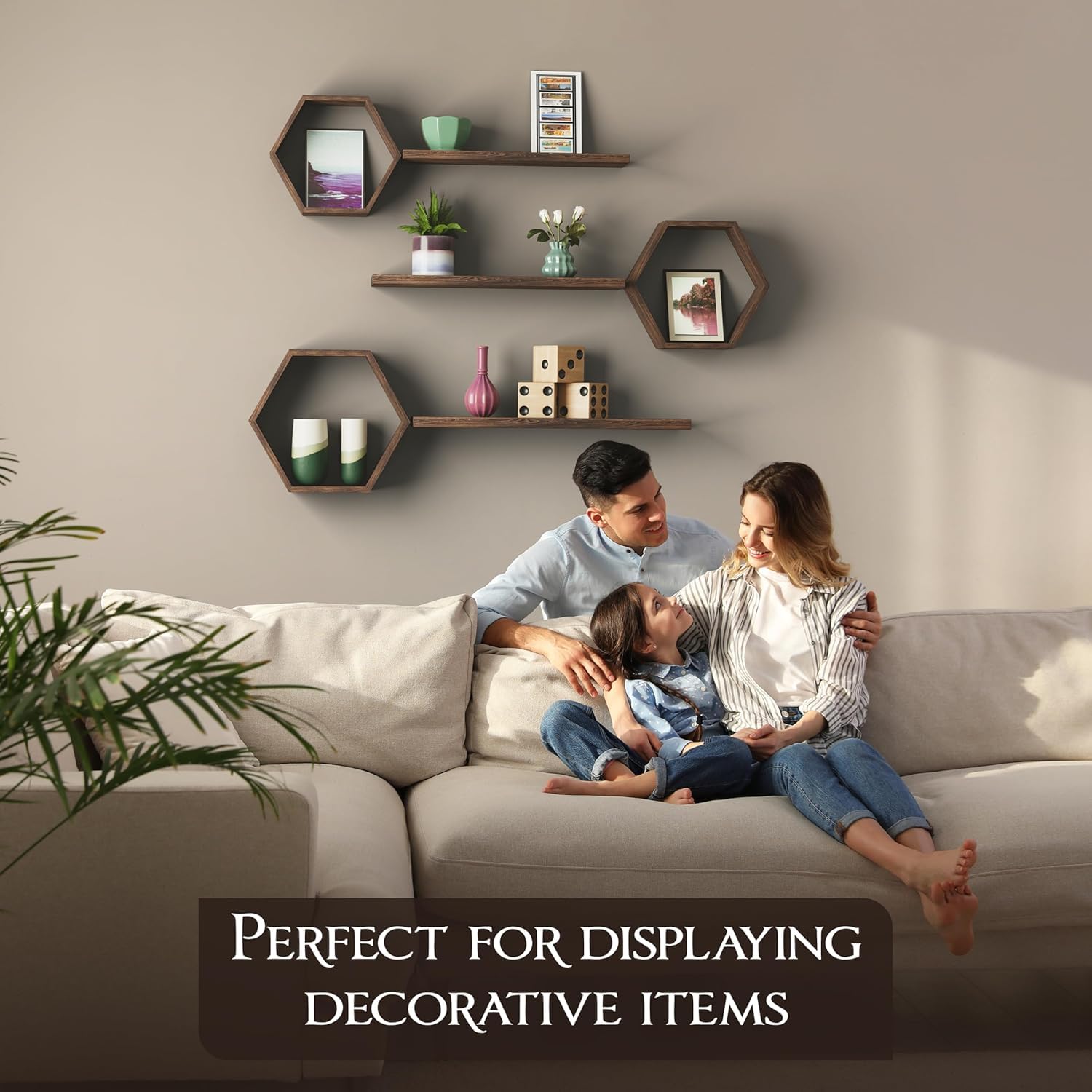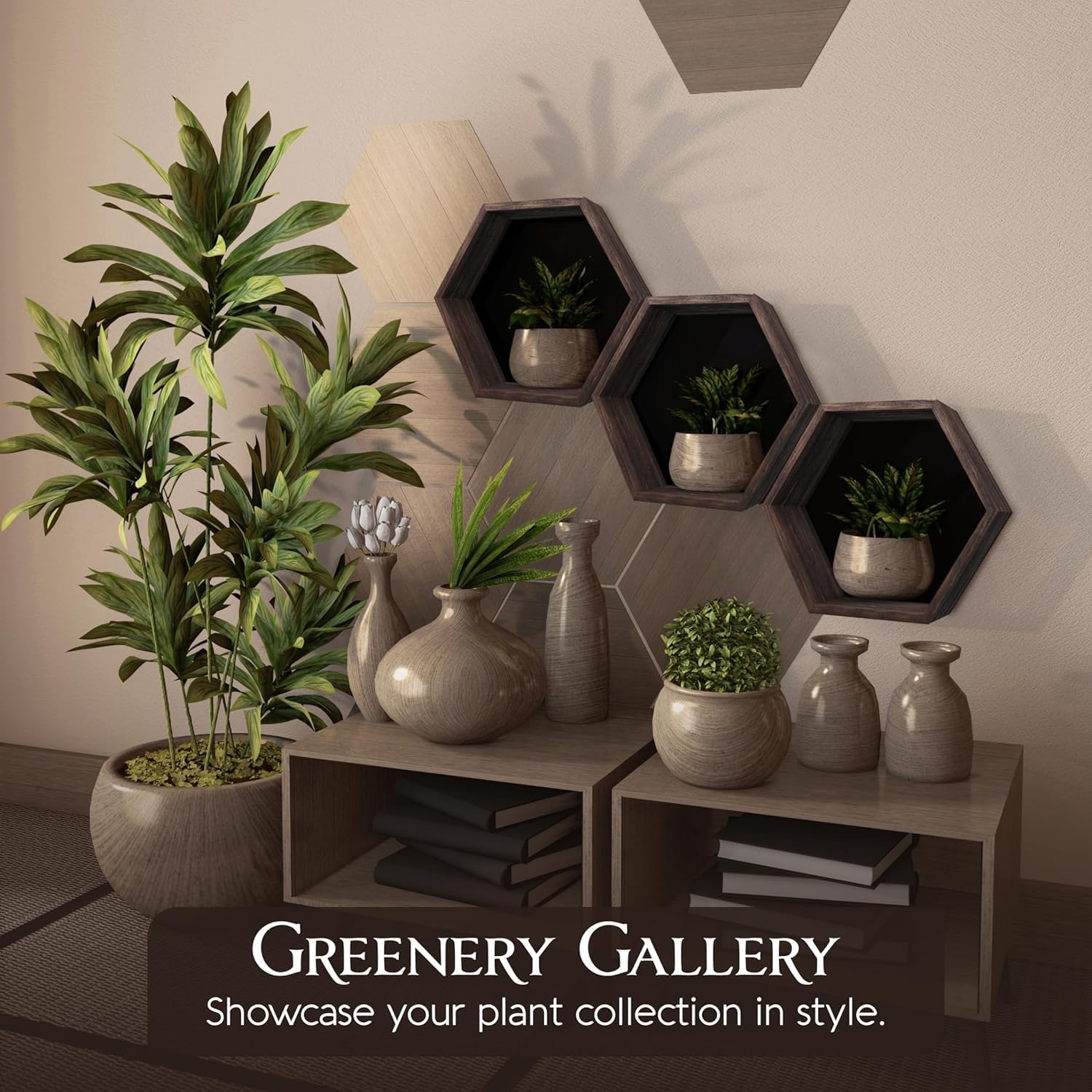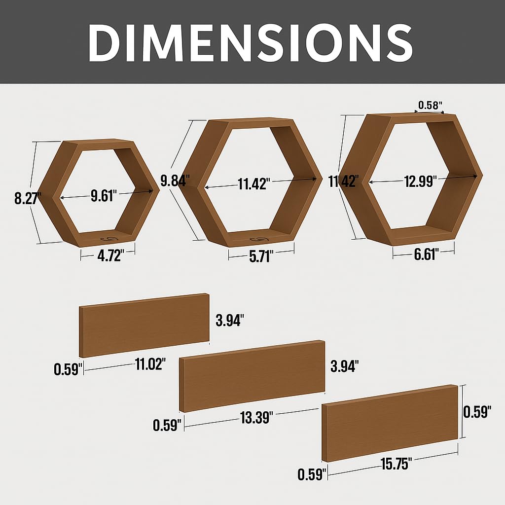 • VERSATILE STORAGE: Three hexagon compartments and three floating shelves provide ample space for plants, decor items, and collectibles