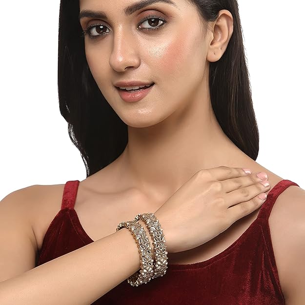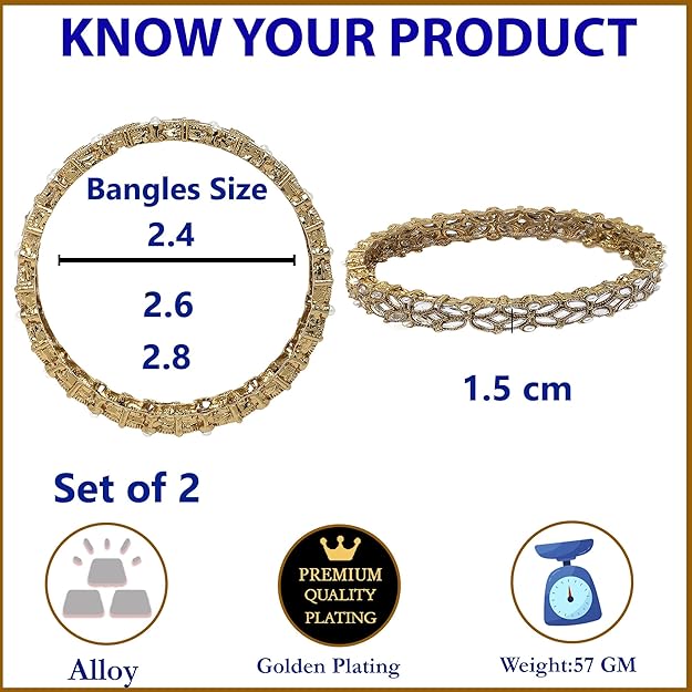- What You Get:- Set Of 2 Gold-Plated Designer Floral Style Bangles has White Kundan studded, secured with Slip-On closure.